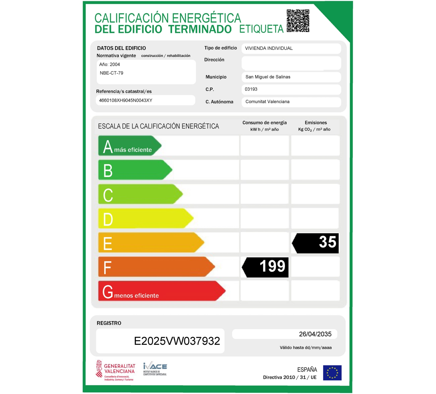 Spacious 2-bedroom, 2-bathroom south-facing ground-floor apartment in a quiet part of San Miguel town centre. The property has a build size of 84.41 m2 (72.62 m2 useful) and in addition has a small private courtyard measuring 15.90 m2 which includes a storage room with washing machine and dryer. The Edificio Galatea building was constructed in 2004 to a very high standard with superior finishings and insulation. It is only a 500 metre (7 minute) walk to the charming church square of San Miguel, and 200 metres (3 minutes) walk to the nearest supermarket. It is a similar distance (240 metres) to the town swmming pool of San Miguel which is open during the summer months with a lifeguard on duty. Of course San Miguel is only a 15 minutes drive to all the wonderful white sand beaches of Torrevieja, Orihuela Costa, Pilar de la Horadada etc and plenty of top golf courses and shopping centres eg the La Zenia Boulevard retail experience!