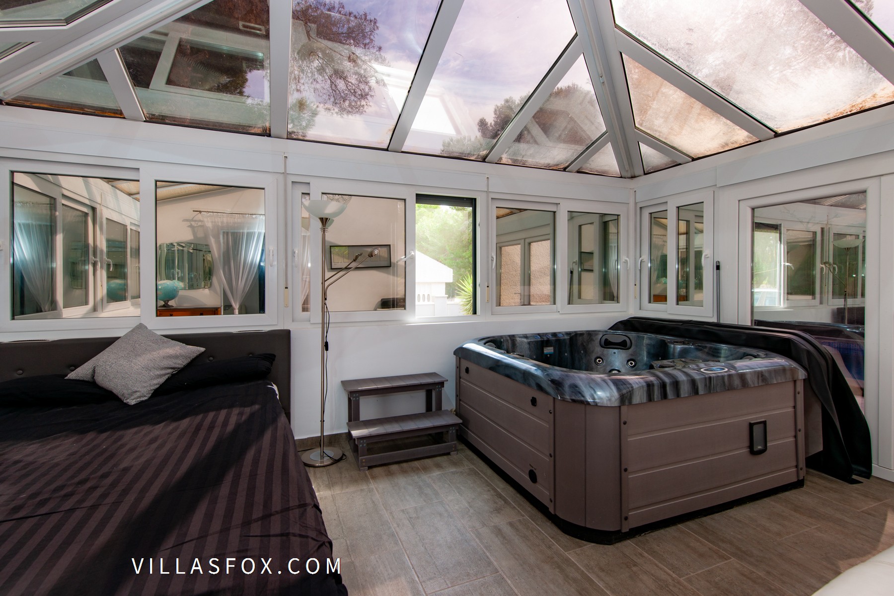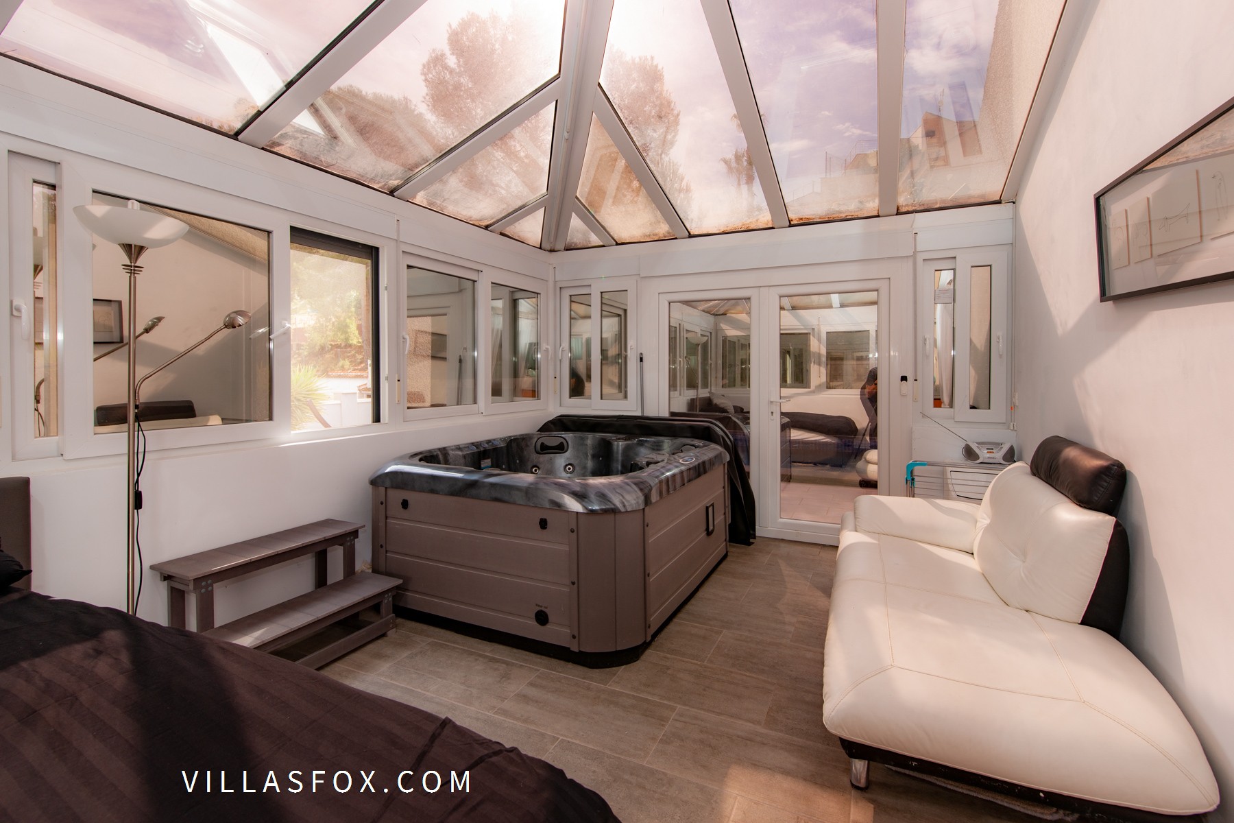 The property itself has both front and rear entrances and comprises a large lounge with separate dining area, open-plan kitchen (fully-fitted to a very high standard) with separate pantry and a hallway leading off from the lounge with access to the 3 double/twin bedrooms and 2 bathrooms (including one en-suite to the master bedroom). The master bedroom continues into the conservatory/jacuzzi area which is fitted with one-way glass for privacy, and also serves as a fourth bedroom if required.